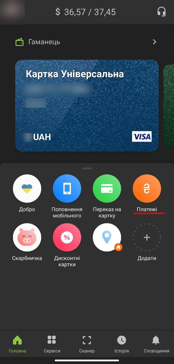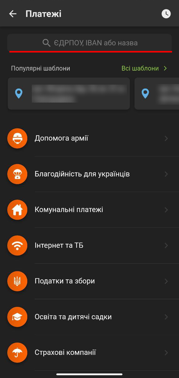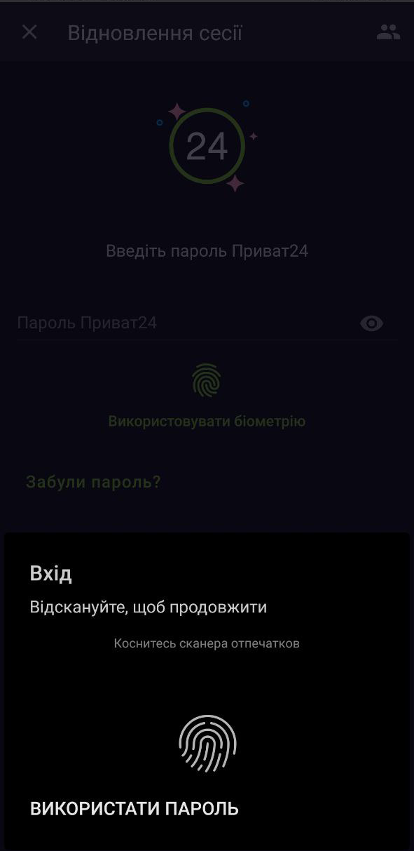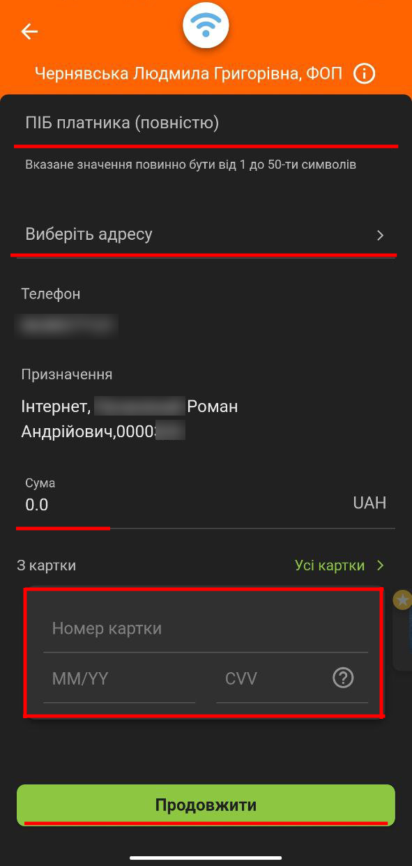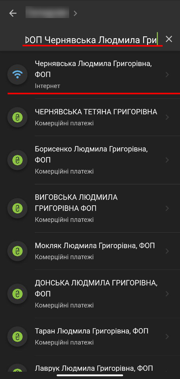 Крок 1. Спочатку необхідно пройти авторизацію за допомогою зручного для Вас способу (за допомогою телефону та паролю, або за допомогою відбитку пальця): Крок 2. Після успішної авторизації, Ви потрапляєте в головне меню де Вам необхідно обрати пункт «Платежі»: Крок 3. У меню «Платежі» натисніть на «Пошук» у верхньому кутку: Крок 4. У меню пошуку введіть «Чернявська Людмила Григорівна, ФОП», та оберіть підприємство із списка нижче: Крок 5. Далі Вам необхідно ввести номер свого особистого рахунку (номер вказано на пам'ятці до договору, або Ви можете подивитися його у особистому кабінеті).Після вводу номеру договору натиність кнопку «Продовжити»: Крок 5. Перевірте свої особисті дані, вкажіть суму оплати, натисніть кнопку «Продовжити» та завершіть оплату: (! звертаємо Вашу увагу що мінімальна сума платежу через системи ПриватБанку становить 50 грн.) Увага! Звертаємо Вашу увагу, що з моменту підключення з Вашого особового рахунку починає зніматися абонплата, щодоби, рівними частками з розрахунку: (Щомісячна абонплата) / (Кількість днів у поточному місяці). Сума грошей, що залишається на рахунку до моменту початку нового місяця, не обнуляється, а переходить на наступний період! Якщо Вам не вдалося оплатити послуги Інтернет, зверніться до цілодобової служби підтримки за телефонами: (068)-908-54-45, (093)-908-54-45.