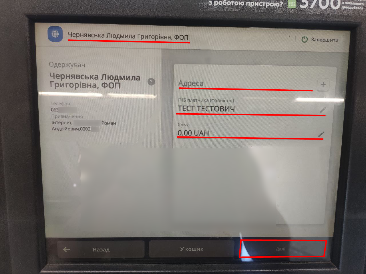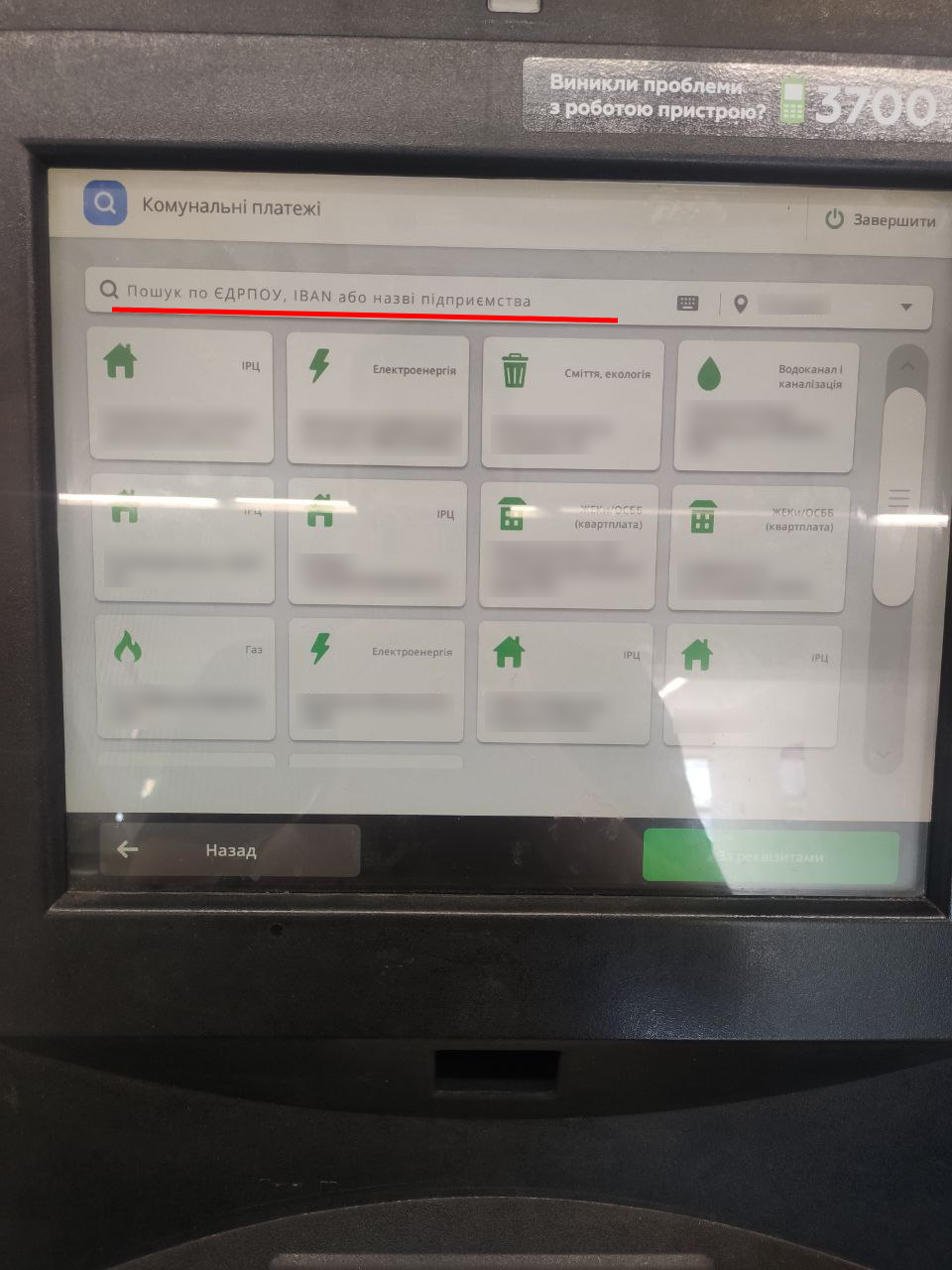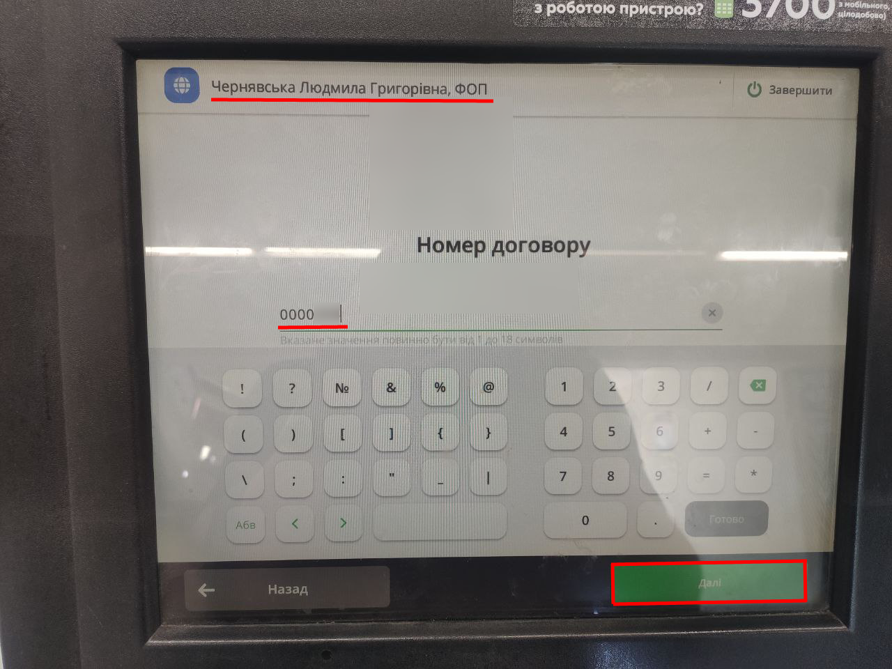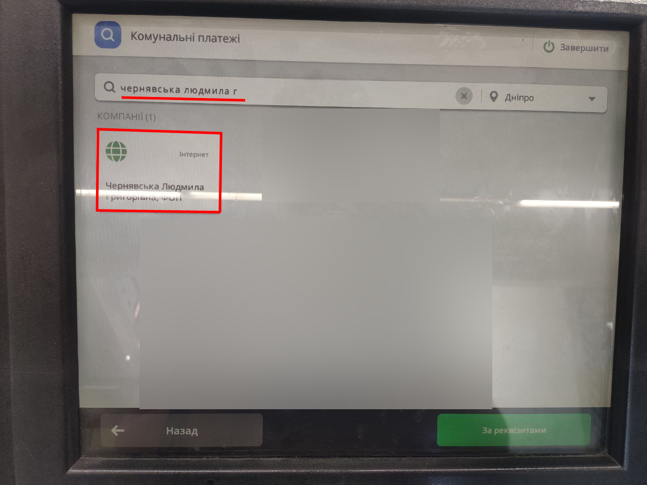 Крок 1. Спочатку необхідно пройти авторизацію за допомогою зручного для Вас способу (за допомогою телефону або QR-коду): Крок 2. Після успішної авторизації, Ви потрапляєте в головне меню де Вам необхідно обрати пункт «Комунальні платежі»: Крок 3. У меню «Комунальні платежі» натисніть на «Пошук» у верхньому кутку: Крок 4. У меню пошуку введіть «Чернявська Людмила Григорівна, ФОП», та оберіть підприємство із списка нижче: Крок 5. Далі Вам необхідно ввести номер свого особистого рахунку (номер вказано на пам'ятці до договору, або Ви можете подивитися його у особистому кабінеті).Після вводу номеру договору натиність кнопку «Далі»: Крок 5. Перевірте свої особисті дані, вкажіть суму оплати, натисніть кнопку «Далі» та завершіть оплату: (! звертаємо Вашу увагу що мінімальна сума платежу через системи ПриватБанку становить 50 грн.) Увага! Звертаємо Вашу увагу, що з моменту підключення з Вашого особового рахунку починає зніматися абонплата, щодоби, рівними частками з розрахунку: (Щомісячна абонплата) / (Кількість днів у поточному місяці). Сума грошей, що залишається на рахунку до моменту початку нового місяця, не обнуляється, а переходить на наступний період! Якщо Вам не вдалося оплатити послуги Інтернет, зверніться до цілодобової служби підтримки за телефонами: (068)-908-54-45, (093)-908-54-45.